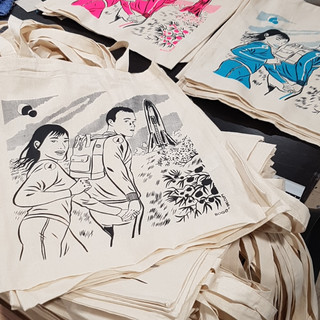 Pour son stage de 3e en insertion professionnelle, Djenna a accompagné notre travail d'artisan d'art autour de l'impression des totebags de la marque locale Boge, d'après une œuvre de Deloupy Zac.