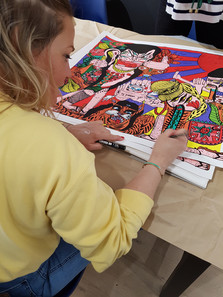 L'atelier a imprimé une sérigraphie de Nolwenn Samson pour la Galerie Deza. L'occasion pour l'artiste salonnaise d'inaugurer sa première estampe : Chop-Chop. Dans cette direction nous avons demandé à l''artiste de réaliser la ligne de contour noire directement sur un film de sérigraphie pour apporter de l'authenticité à l'édition. En partant de cette matrice qui correspond au squelette de l'estampe, notre sérigraphe d'art Delphine Chapuis a pu ensuite confectionner, armée de patience et de scalpels, les dix autres pochoirs en anticipant les superpositions des encres. Permettant ainsi d'obtenir dix-sept teintes à partir de onze couleurs. Ce travail a été accompagné par les stagiaires d'Estampille, étudiantes en Master 2 livre d'artiste et édition d'art de l'UJM, Jeanne Vaillant et Inès Pichaud.